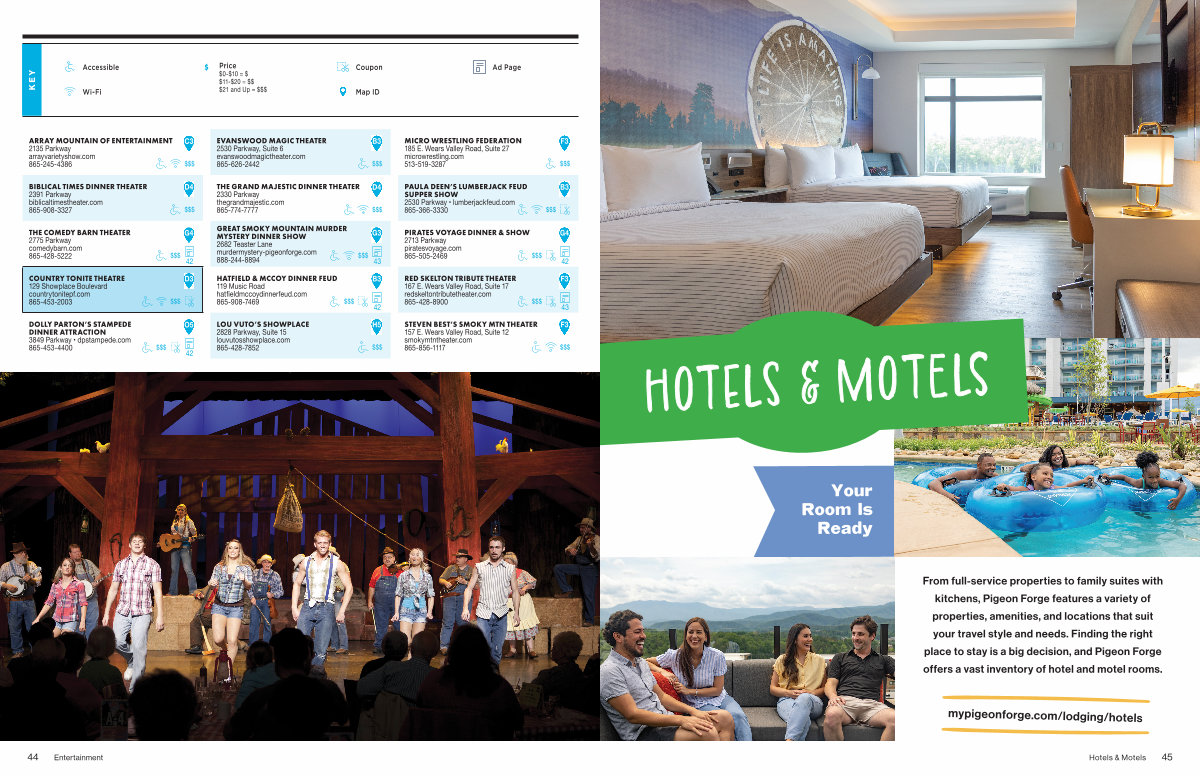 From full-service properties to family suites with kitchens, Pigeon Forge features a variety of properties, amenities, and locations that suit your travel style and needs. Finding the right place to stay is a big decision, and Pigeon Forge offers a vast inventory of hotel and motel rooms. mypigeonforge. com / lodging / hotels