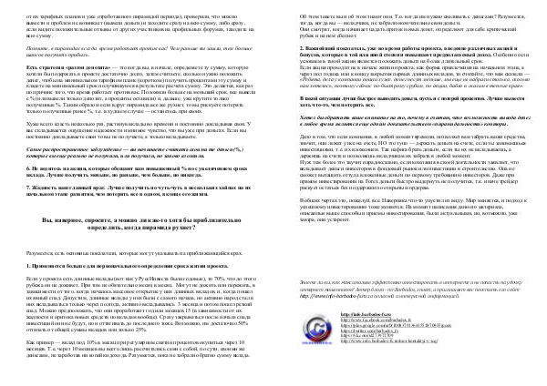 Если у проекта есть длинные вклады( вот как у РуссИнвеста были годовые), то 70 %, что до этого рубежа он не доживет. При том не обязательно месяц в месяц. Могут не дожить или пережить, в зависимости от того, когда началось массовое открытие у них длинных вкладов, и, когда пошел их явный спад. Допустим, длинные вклады у них были с самого начала, но активно народ стал в них вкладываться только через полгода, активно вкладывались 3 месяца и потом пошел резкий спад. Можно предположить, что они проработают год или месяцев 15( в зависимости от их жадности и притока новых средств по вкладам вообще). Сразу закрываться после начала спада инвестиций они не будут, но и оттягивать до последнего тоже. Возможно, им достаточно 50 % оттяпать от общей суммы вкладов или только 25 %.
