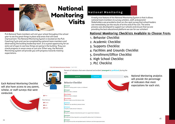 A really nice feature of the National Monitoring System is that it allows national team members to survey scholars , staff , and parents ! Stakeholders are provided a short on-the-spot survey that school leaders can immediately see the results of at the end of the visit . The entire process was developed to support our schools and ensure that we are providing the best educational platform we can for our scholars !