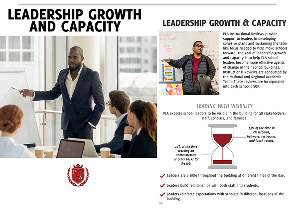 PLA Instructional Reviews provide support to leaders in developing cohesive plans and sustaining the laser like focus needed to help move schools forward. The goal of leadership growth and capacity is to help PLA school leaders become more effective agents of change in their school buildings. Instructional Reviews are conducted by the National and Regional Academic Team. These reviews are incorporated into each school's SQR.