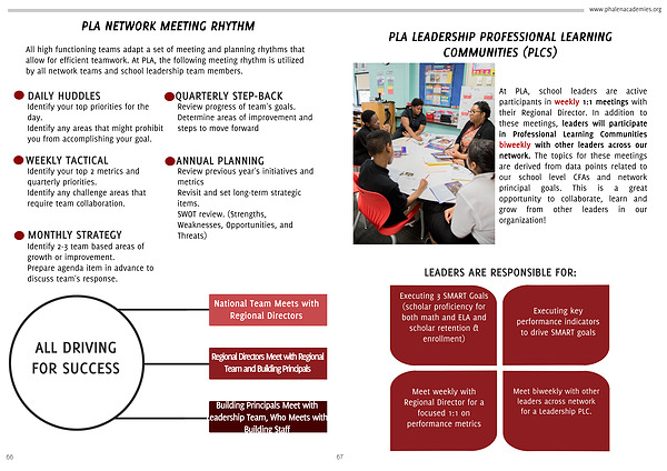 At PLA, school leaders are active participants in weekly 1:1 meetings with their Regional Director. In addition to these meetings, leaders will participate in Professional Learning Communities biweekly with other leaders across our network. The topics for these meetings are derived from data points related to our school level CFAs and network principal goals. This is a great opportunity to collaborate, learn and grow from other leaders in our organization!