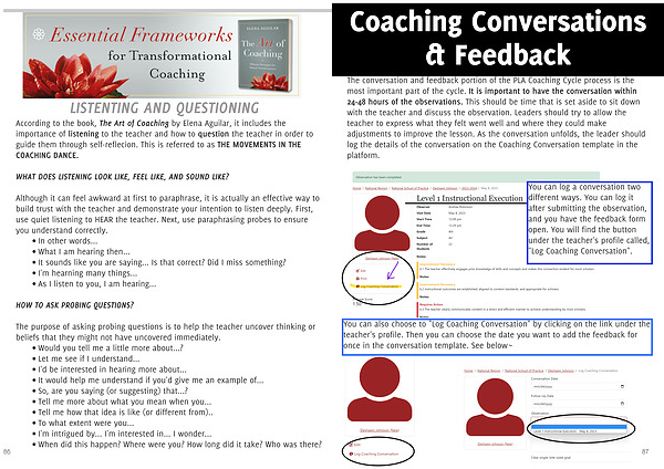 The conversation and feedback portion of the PLA Coaching Cycle process is the most important part of the cycle. It is important to have the conversation within 24-48 hours of the observations. This should be time that is set aside to sit down with the teacher and discuss the observation. Leaders should try to allow the teacher to express what they felt went well and where they could make adjustments to improve the lesson. As the conversation unfolds, the leader should log the details of the conversation on the Coaching Conversation template in the platform.