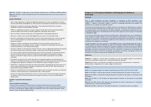 Programa 4.1.2: Promoção da Cidadania e da Participação dos Cidadãos na Governação Contexto: Entre as tarefas fundamentais do Estado consagradas na Constituição de 2010, destacam-se “criar progressivamente as condições necessárias para tornar efectivos os direitos económicos, sociais e culturais dos cidadãos” e “defender a democracia, assegurar e incentivar a participação democrática dos cidadãos e da sociedade civil na resolução dos problemas nacionais”. A atribuição de documentação básica aos cidadãos constitui um pressuposto para habilitá-los para o exercício efectivo dos direitos e liberdades sociais e económicas, sendo, pois, uma área em que o Executivo reafirma o seu compromisso para com a sociedade. Para tal, importa simplificar os procedimentos administrativos no acto de obtenção do Registo Civil e de Identificação Civil e Criminal dos angolanos, tal como consagra a Constituição e a legislação em vigor. Uma outra área relacionada em que o Executivo pretende marcar a diferença passa por criar as condições para que os cidadãos se consigam mobilizar em torno dos objectivos da governação, contribuindo para um reforço da democracia. Com efeito, o Estado necessita de interlocutores representativos da sociedade civil, organizados e capazes de participarem na resolução dos problemas do País, sobretudo a nível local, com o seu melhor conhecimento da realidade das comunidades. O presente programa visa, assim, promover a universalidade de acesso a documentação básica para todos os cidadãos angolanos, através da massificação do registo civil, atribuição do bilhete de identidade, do passaporte e do comprovativo de residência. De igual modo, visa apoiar os cidadãos a constituírem-se como um verdadeiro interlocutor do Estado, através da sua melhor organização e capacitação para o exercício da cidadania e de uma participação mais activa na governação do País, com vista a promover a construção de uma sociedade mais democrática, participativa e reactiva às necessidades dos angolanos, aumentando a participação crescente da sociedade civil no processo de governação, designadamente a nível local. Objectivos: Objectivo 1: Assegurar o exercício pleno da cidadania por parte dos cidadãos angolanos, nomeadamente através da universalidade do registo civil e a atribuição de bilhete de identidade Objectivo 2: Fomentar a participação da sociedade civil na formulação, acompanhamento e avaliação das políticas públicas, designadamente nos órgãos colegiais de âmbito local Metas: Meta 1.1: A população angolana com bilhete de identidade passa de 56% em 2017 para 77% em 2022 Meta 1.2: Até 2022, os 164 municípios possuem Comissões de Moradores a funcionar nos termos da lei Meta 2.1: Até 2022, as 18 províncias de Angola dispõem de Conselhos de Auscultação e Concertação Social dinamizados Meta 2.2: Até 2022, os 164 municípios de Angola possuem Conselhos de Auscultação da Comunidade dinamizados Meta 2.3: Até 2022, 50% das OSC registadas são capacitadas em matérias relacionadas com a formulação, acompanhamento e avaliação das políticas públicas Meta 2.4: Até 2022, o exercício do “Orçamento Participativo” é introduzido em todos os municípios 221