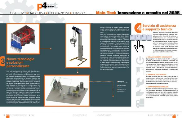 mette di catturare ed estrarre tutte le sostanze volatili e non, migliorando significativamente la qualità del prodotto finale e togliendo tutti i cattivi odori. Main Tech offre anche una gamma di deumidificatori a basso consumo energetico, dotati di sistemi di modulazione, verifica e monitoraggio della temperatura nelle tramogge. L’ offerta è articolata e strutturata per soddisfare sia le esigenze di chi opera con lo stampaggio a iniezione, sia quelle delle aziende impegnate nell’ estrusione o in settori speciali. Questo è reso possibile grazie al lavoro di un team dedicato dell’ Ufficio tecnico, che ogni giorno studia soluzioni innovative per rispondere alle richieste dei clienti e personalizzare le macchine. Attualmente, l’ azienda sta esplorando l’ uso dell’ intelligenza artificiale, valutando l’ opportunità di integrarla nei propri software a bordo delle macchine. Questo approccio è già stato implementato nei sistemi di supervisione forniti in abbinamento ai grandi impianti centralizzati per la gestione del magazzino delle materie prime, dimostrando l’ impegno di Main Tech nell’ adozione di tecnologie all’ avanguardia per migliorare l’ efficienza e la qualità dei propri prodotti.