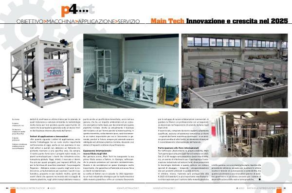 Espansione internazionale: nuova filiale negli USA Nel gennaio scorso, Main Tech ha inaugurato la sua prima filiale estera a Dalton, in Georgia, rafforzando la propria presenza nel mercato nordamericano. Questo è da considerarsi un passo strategico molto importante, che garantisce all’ azienda vicinanza fisica ai clienti nordamericani. La scelta di Dalton non è casuale: la città rappresenta un hub industriale strategico per la trasformazione delle materie plastiche e offre un contesto favorevole