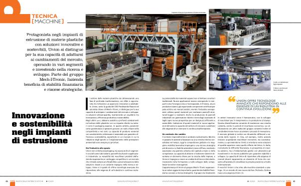 Protagonista negli impianti di estrusione di materie plastiche con soluzioni innovative e sostenibili, Union si distingue per la sua capacità di adattarsi ai cambiamenti del mercato, operando in vari segmenti e investendo nella ricerca e sviluppo. Parte del gruppo