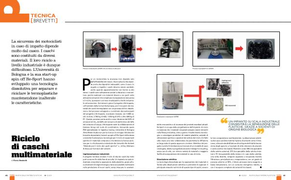 Implementazione industriale Il progetto renderà circolare il ciclo di vita dei caschi da moto post-consumo fin dalla fase di raccolta. Un impianto su scala industriale consentirà la separazione delle plastiche, grazie all’ u- so di solventi di origine biologica. Sarà così possibile riutilizzarle nella produzione di nuovi caschi, senza intaccare le caratteri-