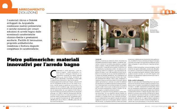 I materiali Rispetto a materiali più tradizionali, Akron, brevettato da Acquabella permette di essere tagliato e modellato facilmente, in modo che il prodotto possa adattarsi a qualsiasi spazio o angolo, e nella più totale sicurezza, grazie all’ assenza di silice. Il materiale viene trattato in superficie con un rivestimento in poliuretano acrilico, che assicura un’ integrazione totale con il supporto e una straordinaria resistenza nel tempo, a urti e alla possibilità di shock termici. Akron è riconosciuto per le sue proprietà antibatteriche e le texture ad altissima definizione, che si distinguono sul mercato per la particolare sensazione al tatto e per l’ estetica perfettamente definita. Akron viene compattato in massa per ottenere una finitura solida e rinforzata. Questa matrice poliuretanica è ottenuta con polioli di polietere che garantiscono incredibili proprietà di resistenza all’ idrolisi e, nota importante, non produce emissioni di composti organici volatili. Occorre solo ricordare alcune precauzioni per una buona manutenzione: evitare il contatto con solventi organici, e prodotti contenenti solventi. Dolotek è un composto di resina poliestere e pietra dolomia senza silice, con una superficie esterna rivestita con uno strato di Gelcoat, che offre un’ eccezionale sensazione morbida e un risultato bianco puro, resistente ed elegante, con caratteristiche d’ uso superiori a quelle dei materiali tradizionali, motivo per cui viene spesso definito“ ceramica del XXI secolo”. Le proprietà chimiche e fisiche di Dolotek consentono la fabbricazione di prodotti di alta qualità tecnica, modellabili in forme complesse dal design funzionale. Il processo tecnologico che permette la produzione di Dolotek è sviluppato in modo efficiente e rispettoso dell’ ambiente. Quando si tratta di progettare la stanza da bagno, sia che si tratti di uno spazio residenziale, commerciale, alberghiero o sanitario, è importante considerare tutti gli aspetti necessari per questa tipologia di ambiente. Questo significa scegliere soluzioni ricercate, con alti livelli d’ igiene, facili da pulire, che garantiscano la piena inclusione per tutti coloro che ne fruiscono.