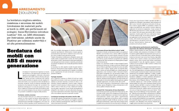 Lustran ® 532, l’ innovazione di Ineos Styrolution La società ha annunciato recentemente il lancio del suo ultimo grado di ABS, Lustran 532, sviluppato per facilità di lavorazione, media brillantezza e una base di colore stabile per l’ autocolorazione. Questo nuovo grado è specificamente progettato per applicazioni di bordi per mobili e completa la gamma esistente di gradi di ABS per estrusione a media brillantezza dell’ azienda. Lustran 532 viene prodotto presso lo stabilimento produttivo di Ineos Styrolution a Wingles, in