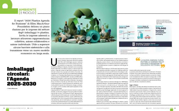 Un nuovo piano d’ azione che stabilisce la direzione per i prossimi cinque anni affinché le aziende della filiera dell’ imballaggio possano realizzare concretamente un’ economia circolare per le materie plastiche su larga scala. Si tratta dell’ Agenda Plastiche 2030 per le Imprese, lanciata lo scorso novembre da Ellen MacArthur Foundation insieme a imprese leader del settore. L’ Agenda si basa sui significativi progressi che sono stati già compiuti da un gruppo pionieristico di società, che rappresenta un quinto del mercato mondiale degli imballaggi in plastica, con l’ iniziativa New Plastics Economy Global Commitment negli anni dal 2018 al 2025. Lanciato nel 2018 da Ellen MacArthur Foundation e dal Programma delle Nazioni Unite per l’ Ambiente, il Global Commitment è diventato il più grande sforzo volontario al mondo per affrontare il tema dei rifiuti e dell’ inquinamento. Questa iniziativa ha individuato nuovi modi possibili di operare che ottimizzano sviluppo, produzione, recupero, riciclo e riutilizzo delle materie plastiche nel settore dell’ imballaggio. L’ Agenda 2030 ha l’ intento di far lavorare insieme le realtà industriali, così da avere maggiore forza per guidare la trasformazione del mercato. Tre gli elementi chiave: rappresentanza collettiva da parte delle imprese per contribuire alla definizione di politiche adeguate ed efficaci, azione collaborativa per condividere rischi, costi e innovazione al fine di superare le barriere sistemiche, azione individuale per accelerare i progressi su alcuni temi fondamentali per la circolarità della plastica e al contempo rafforzare la posizione delle aziende stesse.