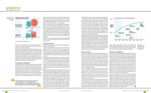 Le barriere sistemiche Una delle barriere sistemiche principali è lo sviluppo di infrastrutture di raccolta e riciclo. È infatti fondamentale ridurre la quantità di rifiuti di imballaggio in plastica che viene generata. È vitale investire nelle infrastrutture per raccogliere e riciclare gli imballaggi in plastica, in considerazione degli oltre 140 milioni di tonnellate di imballaggi in plastica prodotti ogni anno, di cui a livello globale solo circa il 15 % viene riciclato e il 40 % viene gestito in modo improprio. Azioni da parte delle singole imprese, come la progettazione di imballaggi riciclabili e l’ aumento dell’ uso di materiali riciclati, sono certo elementi abilitanti. Tuttavia, le iniziative del singolo non sono sufficienti a sbloccare i miliardi di USD necessari per costruire e sostenere sistemi di raccolta e riciclo efficaci. È necessaria una strategia multi-stakeholder per attrarre investimenti e avviare gli interventi politici adeguati a garantire finanziamenti dedicati e continuativi e la domanda di materiali riciclati. Oggi nel tema del recupero e riciclo si inserisce anche una nuova figura, quella dei waste pickers, ovvero lavoratori indipendenti la cui attività si svolge letteralmente dentro la grande mole di rifiuti che si producono a livello urbano. Queste figure sono ormai diffuse un po’ ovunque nel mondo, non solo nelle zone ad alta povertà, e si occupano di selezionare tra i rifiuti i materiali riciclabili, prelevarli, dividerli per tipologia e rivenderli a terzi che si occupano dell’ effettivo riciclaggio dell’ oggetto. Si tratta di una figura che non è riconosciuta legalmente e che quindi opera senza alcuna tutela. L’ Agenda 2030 ritiene sia giunto il tempo di riconoscere queste figure e attivarsi affinché, assieme anche ad altri lavoratori nell’ industria delle materie plastiche, possano operare in contesti formali e legalmente riconosciuti.