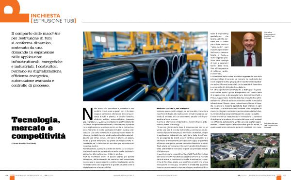 Nella nostra vita quotidiana e lavorativa in vari ambiti è ormai prassi e spesso non ci facciamo neppure particolare attenzione, trovare la presenza di tubi in plastica. In ambito idraulico, elettrico, edilizio, automobilistico, trasporto gas, fognature, irrigazione, riscaldamento o raffreddamento un elenco che potrebbe continuare, il tubo estruso in plastica trova applicazione e soluzione pratica e utile in molte situazioni. Tra l’ altro in molte applicazioni i tubi in plastica costituiscono una scelta sostenibile in quanto possono essere facilmente riciclabili rispetto a tubi realizzati in altri materiali. Questo uso ormai comune del tubo in plastica di piccole, medie e grandi dimensioni ha aperto un mercato molto interessante per i costruttori di macchine per estrusione del materiale plastico. Numerose sono, quindi, le aziende che hanno tra la loro produzione di macchine per estrusione anche quelle dedicate in particolare alla realizzazione di tubi in plastica. Plast ha incontrato alcune di queste aziende per parlare del settore, dell’ andamento del mercato e dell’ innovazione tecnologica in questo specifico ambito, focalizzando anche l’ interesse verso due argomenti di grande attualità come la digitalizzazione e la sostenibilità.