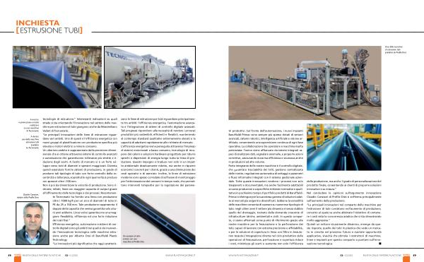 tecnologie di estrusione.” Interessanti indicazioni su quali strade si sta orientando l’ innovazione nel settore delle macchine per estrusione di tubi giungono anche da Massimiliano Vailati di Tecnomatic.“ Le principali innovazioni delle linee di estrusione riguardano vari ambiti. Uno di questi è l’ efficienza energetica con nuovi gruppi di plastificazione con produzione specifica più elevata e motori elettrici a minore consumo. Un ulteriore ambito è rappresentato dalla precisione dimensionale che si ottiene attraverso sistemi di controllo avanzati e automazione che garantiscono tolleranze più strette e riduzione degli scarti. A livello di mercato vi è un forte sviluppo verso tubi di diametri e spessori maggiorati. Diventa quindi essenziale fornire sistemi di produzione, in grado di produrre tali tipologie di tubo con forte controllo della eccentricità e tolleranze, soprattutto ogni qual volta si produce con spessori oltre i 100 mm. Non è poi da dimenticare la velocità di produzione. Sono richieste, infatti, linee con maggiori capacità di output grazie all’ affinamento delle tecnologie e dei processi. Recentemente Tecnomatic ha fornito una linea con produzione oltre i 1000 kg / h per un arco di diametri di tubo in PE da 25 a 160 mm. Tale produzione rappresenta il doppio della capacità che veniva garantita solo alcuni anni addietro. Linee veloci garantiscono una maggiore flessibilità, efficienza ed una forte riduzione dei costi fissi.” Efficienza energetica, automazione e sistemi di controllo digitali sono gli ambiti nei quali si sta muovendo l’ innovazione tecnologica nelle macchine estrusione anche per Alberto Dosi di Baruffaldi Plastic Technology.“ Le innovazioni più significative che oggi caratterizzano le linee di estrusione per tubi riguardano principalmente tre ambiti: l’ efficienza energetica, l’ automazione avanzata e l’ integrazione di sistemi di controllo digitale avanzati. Tali progressi rispondono alla necessità di rendere i processi produttivi più sostenibili, efficienti e flessibili, mantenendo al contempo standard qualitativi estremamente elevati e la capacità di adattarsi rapidamente alle richieste di mercato. L’ efficienza energetica viene perseguita attraverso l’ impiego di sistemi motorizzati a basso consumo, tecnologie di recupero del calore e soluzioni hardware progettate per ridurre sprechi e dispersioni di energia lungo tutta la linea di produzione. Questo impegno si traduce non solo in un impatto ambientale drasticamente ridotto, ma anche in risparmi economici concreti per i clienti, grazie a una diminuzione dei costi operativi e di esercizio. Inoltre, le linee di estrusione moderne sono spesso corredate di software di monitoraggio per l’ ottimizzazione dei consumi in tempo reale, che permettono interventi tempestivi per la regolazione dei parame-