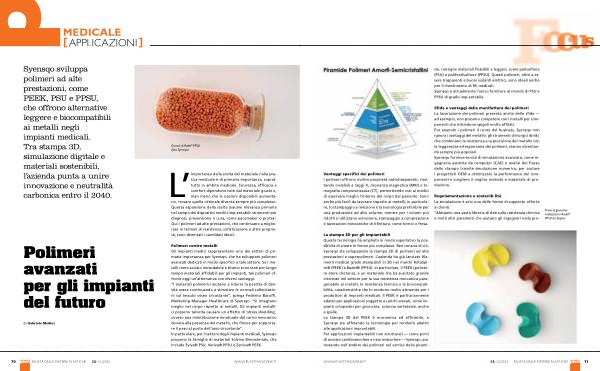 La stampa 3D per gli impiantabili Questa tecnologia ha ampliato in modo superlativo la possibilità di creare le forme più complesse. Ben conscia di ciò, Syensqo sta sviluppando la stampa 3D di polimeri ad alte prestazioni e superpolimeri. L’ azienda ha già lanciato filamenti medical grade stampabili in 3D nei marchi KetaSpire ®( PEEK) e Radel ®( PPSU). In particolare, il PEEK( polietere etere chetone), è un materiale che ha suscitato grande interesse nel settore per la sua resistenza meccanica paragonabile ai metalli, la resistenza termica e la biocompatibilità, caratteristiche che lo rendono molto attraente per i produttori di impianti medicali. Il PEEK è particolarmente adatto per applicazioni soggette a carichi elevati, come impianti ortopedici per ginocchia, colonna vertebrale, anche e spalle. La stampa 3D del PEEK è economica ed efficiente, e Syensqo sta affinando la tecnologia per renderlo adatto alle applicazioni impiantabili. Per applicazioni impiantabili non strutturali— come porti di accesso cardiovascolare e neurovascolare— Syensqo, pur restando nell’ ambito dei polimeri nel vertice della piramide, consiglia materiali flessibili e leggeri, come polisulfone( PSU) e polifenilsulfone( PPSU). Questi polimeri, oltre a essere trasparenti e buoni isolanti elettrici, sono ideali anche per il rivestimento di fili medicali. Syensqo è attualmente l’ unico fornitore al mondo di PSU e PPSU di grado impiantabile.