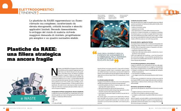 Le plastiche da RAEE rappresentano un flusso rilevante ma complesso, caratterizzato da elevata eterogeneità, criticità tecniche e sbocchi applicativi limitati. Secondo Assoambiente, lo sviluppo del riciclo di materia richiede maggiore domanda di riciclato, progettazione più semplice e un quadro normativo stabile.