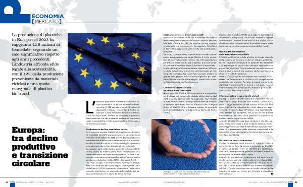 ’ industria produttrice di materie plastiche in Europa rappresenta un settore economico chiave , con oltre 51.700 aziende e più di 1,5 milioni di dipendenti . Tuttavia , i recenti dati di Plastics Europe per il 2023 , diffusi nel documento “ Plastics – the fast Facts 2024 ”, rivelano un comparto in profonda trasformazione , tra cali produttivi , tentativi di transizione verso la sostenibilità e sfide globali legate al commercio e all ’ economia circolare .
