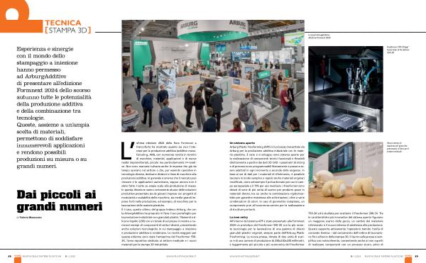 ’ ultima edizione 2024 della fiera Formnext a Francoforte ha mostrato quanto sia vivo l ’ interesse per la produzione additiva ( additive manufacturing , AM ), con numerose novità in termini di macchine , materiali , applicazioni e di nuove realtà imprenditoriali , piccole ma particolarmente innovative . Non sono mancate tuttavia anche le imprese che già da tempo operano nel settore o che , pur essendo operative in tecnologie diverse , dedicano divisioni e linee di macchine alla produzione additiva . In generale è emerso che il mercato può crescere e le applicazioni aumentano , seppur ancora non è stato fatto il salto su ampia scala alla produzione di massa . In questa direzione vanno certamente alcune delle soluzioni produttive presentate sia da giovani imprese con progetti di modularità e scalabilità delle macchine , sia medie-grandi imprese forti nella produzione , ad esempio , di macchine per la lavorazione delle materie plastiche . È il caso , questo ultimo , del gruppo tedesco Arburg , che con la ArburgAdditive ha proposto in fiera il suo portafoglio per la produzione industriale con granulati plastici , filamenti e silicone liquido ( LSR ) con un totale di sei presse in mostra e numerosi esempi di componenti di settori diversi , presentando anche soluzioni tecnologiche in cui stampaggio a iniezione e produzione additiva si combinano . Le novità maggiori per questa edizione sono state l ’ anteprima del Freeformer 550- 3X , l ’ area espositiva dedicata al settore medicale e i nuovi materiali per la stampa 3D industriale .