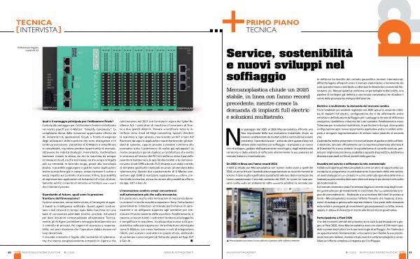 Investire nel service e rafforzare la rete commerciale Il 2026 si prospetta per Meccanoplastica come un anno di opportunità. L’ a- zienda ha in programma un potenziamento importante della rete service, un asset strategico in un contesto in cui la continuità operativa delle linee e l’ assistenza post-vendita diventano elementi sempre più decisivi nelle scelte dei trasformatori. Sul mercato domestico pesa l’ incertezza legata al recente stop degli incentivi governativi per gli investimenti in macchinari. Pur comprendendo la logica del provvedimento – finalizzato a una revisione dei criteri di accesso ai fondi – Meccanoplastica riconosce l’ effetto frenante che l’ assenza di strumenti di sostegno genera sulle imprese italiane. Una parte della domanda resta solida e proseguirà gli investimenti già programmati; un’ altra, invece, appare in attesa di chiarezza in merito alle future misure governative. p Meccanoplastica presenta il nuovo software di gestione delle soffiatrici elettriche