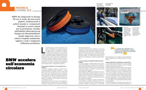 In alto, dal rifiuto al filamento: un processo di trasformazione che non solo riduce i costi, ma evita anche l’ uso di materie prime vergini, dimostrando che l’ innovazione può essere davvero circolari polveri esauste all’ anno. Il materiale rigenerato viene rielaborato in due forme principali: da un lato i filamenti, destinati ai processi di Fused Filament Fabrication( FFF) e adatti per la realizzazione di componenti di piccola e media dimensione; dall’ altro i granuli, utilizzabili nella Fused Granulate Fabrication( FGF), una tecnologia particolarmente indicata per la produzione di utensili di grandi dimensioni.