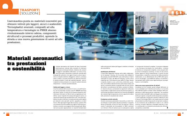 Verso una nuova generazione di velivoli Considerati nel loro insieme, questi sviluppi delineano un nuovo paradigma per l’ industria aeronautica, in cui la scelta del materiale assume lo stesso valore strategico della progettazione e dell’ organizzazione industriale. I termoplastici avanzati rendono possibili cabine più leggere e processi produttivi più rapidi; i compositi ad alta temperatura ampliano i confini applicativi sostituendo materiali tradizionali come il titanio; le tecnologie PEKK a ciclo rapido aprono la strada alla produzione ad alta frequenza di componenti complessi. È una rivoluzione che modificherà il modo in cui i velivoli verranno concepiti, fabbricati e impiegati negli anni a venire, contribuendo a un’ industria aeronautica più efficiente, competitiva e sostenibile.