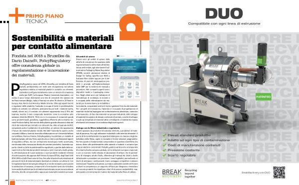 PolicyRegulatory nasce nel 2018 a Bruxelles , per iniziativa di Dario Dainelli , professionista con molti anni di esperienza nel settore regolatorio relativo ai materiali plastici in contatto con alimenti . L ’ azienda si configura inizialmente come un servizio di consulenza svolto per EuPC , la European Plastics Converters Association , e si evolve in poco tempo diventando una rete di consulenti che operano da tre Paesi europei ( Belgio , Italia e Francia ) con oltre 70 clienti in 25 Paesi in Europa , Asia , Nord e Sud America , Medio Oriente . Oltre agli aspetti tecnici e regolatori delle plastiche , l ’ azienda si occupa di tutte le problematiche relative al contatto con alimenti , praticamente per tutti i materiali ( carta , metalli , siliconi ecc .). Il contatto con alimenti rappresenta circa il 75 % del business , mentre il resto comprende tematiche come le normative sulle sostanze chimiche ( REACH , TSCA ecc .) e la sicurezza di consumers goods come prodotti tessili , gioielleria , oggettistica afferente alle normative General Products Safety . Nel mondo della plastica grande rilevanza è data dal riciclo dei materiali per contatto con alimenti che , oltre al business del PET , comprende anche il polistirolo e le poliolefine , un settore che rappresenta il futuro dei materiali plastici riciclati . Nel 2021 l ’ azienda ha aperto anche una sede a Milano , facendo leva sulla collaborazione con Università italiane come Milano , Parma e Firenze . PolicyRegulatory ha adottato un modello di business ispirato alle law firms , avendo al suo interno professionisti esperti di regulatory affairs , ma con un ’ impronta tecnologica molto accentuata , corroborata dalla conoscenza diretta dei processi produttivi . L ’ azienda supporta i clienti su tutte le problematiche regolatorie , a partire dalle determinazioni di conformità dei prodotti immessi su tutti i mercati a livello globale , all ’ introduzione di nuove sostanze o nuovi prodotti mediante richiesta di autorizzazione alle agenzie dell ’ Unione Europea ( EFSA ), degli Stati Uniti ( FDA , EPA ) e di altri Paesi come la Cina , fino alla richiesta di autorizzazione di processi di riciclo di materiali plastici destinati al contatto con alimenti . Con le regolamentazioni sempre più stringenti , si rende necessario promuovere la sostituzione di sostanze , componenti e formulazioni tanto da richiedere la necessità di petizioni per la richiesta di autorizzazione per nuove sostanze chimiche , biocidi , composti attivi , oppure per materiali innovativi e processi .