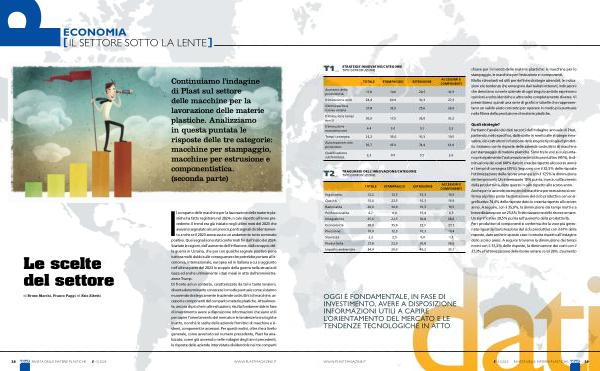 Quali strategie? Partiamo l’ analisi dei dati raccolti dall’ Indagine annuale di Plast, partendo, nello specifico, dalle scelte in merito alle strategie innovative, dei costruttori in funzione delle singole tipologie di prodotto. Iniziamo con le risposte delle aziende costruttrici di macchine per stampaggio di materie plastiche. Sono tre le voci su cui puntano principalmente: l’ automazione del ciclo produttivo( 45 %), la diminuzione dei costi( 40 % dato in crescita rispetto allo scorso anno) e i tempi di consegna( 35 %). Seguono con il 32,5 % delle risposte l’ ottimizzazione delle risorse umane e con il 17,5 % la diminuzione dei tempi morti. Un interessante 10 % punta, invece, sull’ aumento della produttività, dato questo in calo rispetto allo scorso anno. Anche per le aziende costruttrici di macchine per estrusione si conferma al primo posto l’ automazione del ciclo produttivo con un significativo 74,4 % delle risposte dato in crescita rispetto allo scorso anno. A seguire, con il 35,9 %, la diminuzione dei tempi morti e a breve distanza con un 25,6 % l’ ottimizzazione delle risorse umane. Un significativo 20,5 % punta sull’ aumento della produttività. Per i produttori di componenti si conferma che la voce più gettonata riguarda l’ automazione del ciclo produttivo con il 61 % delle risposte, dato anche in questo caso in crescita rispetto all’ indagine dello scorso anno. A seguire troviamo la diminuzione dei tempi morti con il 31,2 % delle risposte, la diminuzione dei costi con il 27,3 % e l’ ottimizzazione delle risorse umane con il 26 %. L’ aumento
