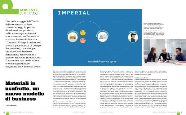 Engineering, parte dell’ Imperial College, è stato denominato“ Materials as a service”, ispirandosi al modello di business cui in parte siamo già abituati del“ Product as a service”. Questo ultimo lo ritroviamo, ad esempio, nel car leasing e nel car sharing e ultimamente nel ride sharing, in cui consumatore o azienda non comprano il prodotto ma il servizio. O ancora, pensando ai prodotti di largo consumo, i cilindri ricarica per gasatori acqua sono un perfetto esempio di prodotto che torna al produttore. Questo modello di business è già di per sé importante, poiché introduce l’ idea di tempo: non si acquisisce un prodotto, ma le sue funzionalità all’ interno di un dato lasso di tempo. Il professore associato in Design Engineering Marco Aurisicchio, laureato in ingegneria meccanica all’ Università degli Studi di Roma La Sapienza e tra i fondatori della Dyson School of Design Engineering, ha sviluppato con i suoi collaboratori un modello di business in cui il materiale rimane sostanzialmente di proprietà del suo produttore. Nel caso di materiali come i metalli possono essere le stesse compagnie di estrazione, nel caso di materiali come le plastiche sono le aziende chimiche che le producono a detenerne la proprietà o in caso i produttori dei semilavorati. Il materiale diviene quindi un servizio e i trasformatori pagano il servizio. Alla fine del ciclo di vita del prodotto il materiale torna al produttore originale.