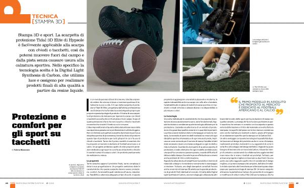 La tecnologia Una volta individuate le caratteristiche che la scarpetta di protezione doveva assolutamente avere, tutte fondamentali, Hypsole ha iniziato a considerare quale tecnologia utilizzare per la produzione. L’ azienda era alla ricerca di un metodo di produzione che garantisse qualità costante e in quantità importanti. La prima a essere testata è stato lo stampaggio a iniezione; tuttavia, la necessità di avere modelli realizzati su misura di ogni disciplina sportiva interessata e di ogni misura di piede, implicava un costo notevole per il numero di stampi. Sarebbe infatti stato necessario creare uno stampo adeguato a ogni modello e misura di piede. Guardando al progetto di questa scarpetta di protezione, si vede oltretutto che ogni modello avrebbe avuto una specifica curvatura e spessore parete, creando difficoltà di distacco dallo stampo. Durante le prove effettuate sono emersi anche problemi di ritiro e deformazione. Hypsole ha allora deciso di semplificare il prodotto in termini di materiale e design e riconsiderare nuovamente lo stampaggio a iniezione. Tuttavia, uno degli stampatori consultati forniva anche un servizio di stampa 3D adatto per la grande produzione di prodotti finiti destinati al mercato. Si tratta della Digital Light Synthesis di Carbon, una tecnologia già utilizzata da altri