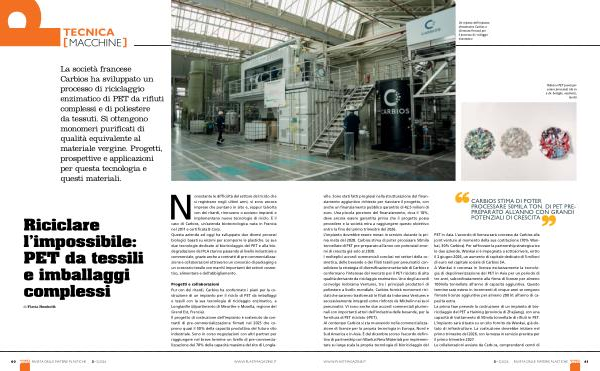 ville. Sono stati fatti progressi nella strutturazione del finanziamento aggiuntivo richiesto per riavviare il progetto, con anche un finanziamento pubblico garantito di 42,5 milioni di euro. Una piccola porzione del finanziamento, circa il 10 %, deve ancora essere garantita prima che il progetto possa procedere e la società mira a raggiungere questo obiettivo entro la fine del primo trimestre del 2026. L’ impianto dovrebbe essere messo in servizio durante la prima metà del 2028. Carbios stima di poter processare 50mila tonnellate di PET pre-preparato all’ anno con potenziali enormi di crescita già solo al 2030. I molteplici accordi commerciali conclusi nei settori della cosmetica, delle bevande e dei filati tessili per pneumatici consolidano la strategia di diversificazione settoriale di Carbios e confermano l’ interesse del mercato per il PET riciclato di alta qualità derivante da riciclaggio enzimatico. Uno degli accordi coinvolge Indorama Ventures, tra i principali produttori di poliestere a livello mondiale. Carbios fornirà monomeri riciclati che saranno trasformati in filati da Indorama Ventures e successivamente integrati come rinforzo da Michelin nei suoi pneumatici. Vi sono anche due accordi commerciali pluriennali con importanti attori dell’ industria delle bevande, per la fornitura di PET riciclato( rPET). Al contempo Carbios si sta muovendo nella commercializzazione di licenze per la propria tecnologia in Europa, Nord e Sud America e in Asia. È del dicembre scorso l’ accordo definitivo di partnership con Wankai New Materials per implementare su larga scala la propria tecnologia di bioriciclaggio del