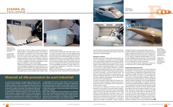Sicurezza e su misura Nel settore dei veicoli ricreazionali( Recreational Vehicle, RV), Caracol ha collaborato a un progetto di LG Project Management, azienda svizzera focalizzata su soluzioni per la mobilità, per la produzione della struttura monoscocca dell’ RV The Cab. Quattro le particolarità di questo progetto: è il primo modulo abitativo mobile completamente stampato in 3D, è realizzato in un unico pezzo, è stato realizzato attraverso un workflow completamente digitale design-to-print, è stato utilizzato materiale polimerico riciclato. Fondamentali per questo progetto sono stati la tecnologia e il know-how sull’ intero flusso- dal design ai materiali, dalla produzione al post-processing- per garantire la scalabilità industriale e il rispetto degli standard normativi. Il progetto è stato sviluppato con una visione di lungo termine verso l’ industrializzazione. La scelta di un polimero riciclato a base PET, rinforzato con fibra di vetro e resistente ai raggi UV, ha garantito le prestazioni meccaniche, termiche e di resistenza al fuoco richieste per applicazioni outdoor e mobili. La monoscocca, con dimensioni di 4,3 × 2,1 × 2,1 metri, è stata stampata in un unico pezzo in un processo continuo, eliminando la necessità di stampi in vetroresina, adesivi e assemblaggi multipli. Sono stati così ridotti anche gli scarti di circa il 60 % rispetto ai metodi tradizionali in vetroresina, mentre i tempi di produzione sono passati dai tre mesi circa con i processi convenzionali a una settimana sola con la LFAM. Le uniche fasi di post-lavorazione sono state la carteggiatura e la verniciatura. L’ approccio tecnologico ha migliorato i requisiti ambientali,