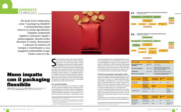 Confronti tra monomateriale, poliaccoppiato e rigido La scelta tra packaging flessibile e rigido rappresenta una delle decisioni più strategiche nell’ industria degli imballaggi, in particolare per quanto concerne il suo impatto ambientale. Il packaging flessibile è caratterizzato da un uso ridotto di materiali rispetto a equivalenti rigidi in vetro, metallo o polimeri termoplastici. Questa minore quantità di materiale si traduce in una significativa riduzione dell’ impronta ambientale complessiva, sia nei processi di fabbricazione che in quelli di trasporto. La scelta tra packaging flessibile poliaccoppiato e monomateriale punta a fornire alla pratica del riciclo meccanico materiali definiti, monomateriale, che possano trovare sbocco certo nei flussi di riciclo meccanico del materiale e non solo nel recupero energetico 3. Per quantificare in modo scientifico gli impatti ambientali complessivi e supportare le comunicazioni ai propri stakeholders, si