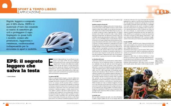 La natura dell’ EPS L’ EPS è un materiale rigido e leggero, composto mediamente al 98 % d’ aria. Massa volumica per applicazioni in edilizia o imballaggio tipicamente compresa tra 15 e 35 Kg / m3. E’ atossico, inerte, non contiene clorofluorocarburi( CFC), né idroclorofluorocarburi( HCFC). La proprietà che fa dell’ EPS un materiale ottimale per realizzare lo strato interno dei caschi deriva dalla sua struttura a celle chiuse, frutto di un particolare processo produttivo. Il polistirene espanso si ottiene unendo allo stirene additivi e pentano nella fase di polimerizzazione. Così si originano perle trasparenti che successivamente, durante il processo di produzione, vengono messe a contatto con vapore acqueo. Le perle si rigonfiano fino a 20-50 volte rispetto al loro volume iniziale, formando una struttura a celle chiuse piene di aria, che conferisce al polistirene espanso le sue prin-