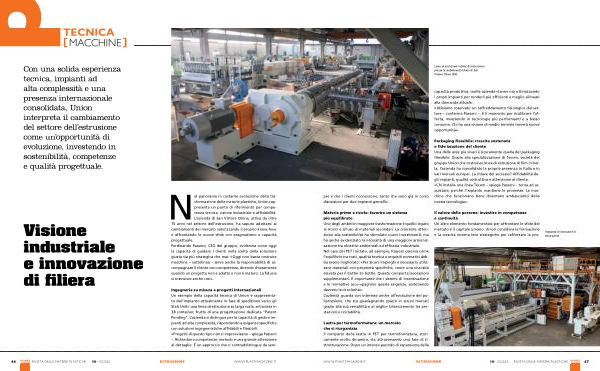 Packaging flessibile: crescita sostenuta e fidelizzazione del cliente Una delle aree più vivaci è sicuramente quella del packaging flessibile. Grazie alla specializzazione di Tecom, società del gruppo Union che costruisce linee di estrusione di film in bolla, l’ azienda ha consolidato la propria presenza in Italia e in vari mercati europei. La chiave del successo? Affidabilità degli impianti, qualità costruttiva e attenzione al cliente. « Chi installa una linea Tecom – spiega Passoni – torna ad acquistare, perché l’ impianto mantiene le promesse. Le macchine che funzionano bene diventano ambasciatrici della nostra tecnologia ».