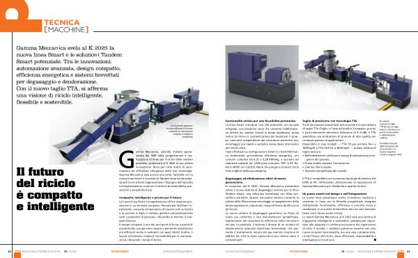 Gamma Meccanica svela al K 2025 la nuova linea Smart e le soluzioni Tandem Smart potenziate. Tra le innovazioni: automazione avanzata, design compatto, efficienza energetica e sistemi brevettati per degasaggio e deodorazione. Con il nuovo taglio TTA, si afferma una visione di riciclo intelligente, flessibile e sostenibile.
