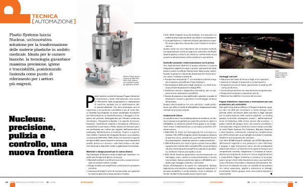 Plastic Systems, società del gruppo Pegaso Industries, è riconosciuta a livello internazionale come punto di riferimento nella progettazione e realizzazione di macchine ausiliarie per la trasformazione delle materie plastiche. Con oltre venticinque anni di esperienza e una presenza consolidata in più di cento Paesi, l’ azienda ha sviluppato un ampio portafoglio di soluzioni per l’ alimentazione, la deumidificazione, il dosaggio e il trasporto dei polimeri, distinguendosi per l’ elevato contenuto tecnologico, l’ integrazione digitale e la capacità di personalizzazione. L’ attenzione costante a innovazione, efficienza e sostenibilità ha permesso a Plastic Systems di diventare partner privilegiato per i settori più esigenti: dall’ automotive al packaging, dall’ elettronica al medicale. Proprio in quest’ ultimo ambito, l’ azienda ha sviluppato Nucleus, una soluzione composta da DWH Mini, TMX e DUG, che risponde ai requisiti stringenti delle camere bianche e introduce nuovi standard di qualità, precisione e sicurezza nella trasformazione dei polimeri destinati a dispositivi medici e applicazioni biomedicali.