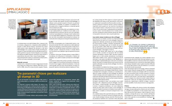 via, la stessa stampa 3D offre supporto e soluzioni grazie alla sua flessibilità nella messa a punto del prodotto o del processo, migliorando funzionalità ed efficienza della macchina- ad esempio, attraverso la riduzione del peso. Questa versatilità è importante anche quando per una macchina di produzione sono necessari ricambi o componenti ex-novo in tempi rapidi. Il fermo di una macchina per il packaging diventa rapidamente esoso, mentre i costi di produzione di un ricambio anche in caso siano inizialmente elevati mediante stampa 3D, divengono trascurabili a fronte di un fermo macchina più breve.