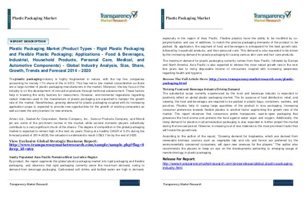 Vastly Populated Asia Pacific Remains Most Lucrative Region By product, the report segments the global plastic packaging market into rigid packaging and flexible packaging, and observes that rigid packaging currently serve the maximum demand, owing to demand from beverage packaging. Carbonated soft drinks and bottled water are high in demand,