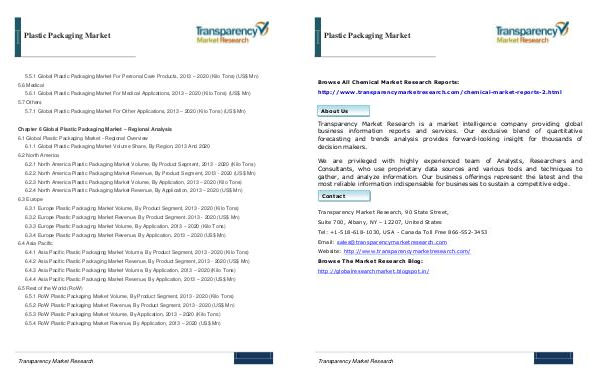 6.5 Rest of the World( RoW) 6.5.1 RoW Plastic Packaging Market Volume, By Product Segment, 2013- 2020( Kilo Tons) 6.5.2 RoW Plastic Packaging Market Revenue, By Product Segment, 2013- 2020( US $ Mn) 6.5.3 RoW Plastic Packaging Market Volume, By Application, 2013 – 2020( Kilo Tons) 6.5.4 RoW Plastic Packaging Market Revenue, By Application, 2013 – 2020( US $ Mn)