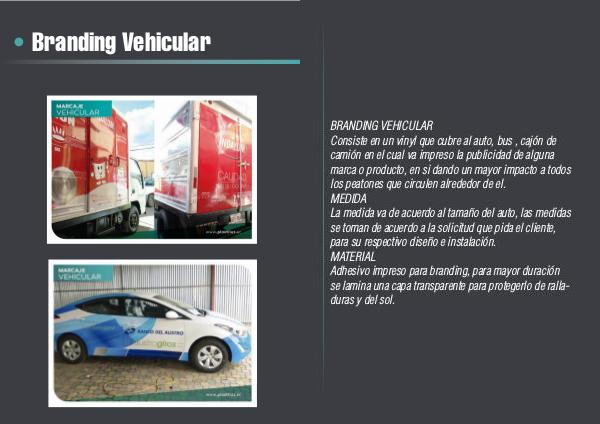 BRANDING VEHICULAR Consiste en un vinyl que cubre al auto, bus, cajón de camión en el cual va impreso la publicidad de alguna marca o producto, en si dando un mayor impacto a todos los peatones que circulen alrededor de el. MEDIDA La medida va de acuerdo al tamaño del auto, las medidas se toman de acuerdo a la solicitud que pida el cliente, para su respectivo diseño e instalación. MATERIAL Adhesivo impreso para branding, para mayor duración se lamina una capa transparente para protegerlo de ralladuras y del sol.