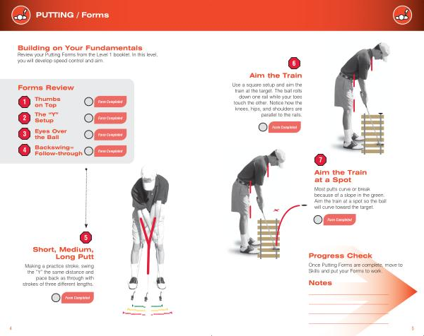 Use a square setup and aim the train at the target . The ball rolls down one rail while your toes touch the other . Notice how the knees , hips , and shoulders are parallel to the rails .
