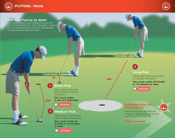 After completing all of your Putting Forms , you can take this Putting Skills test . It has three parts — a short putt , a medium putt , and a long putt . All three parts must be completed with your coach .