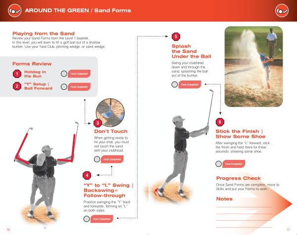 Review your Sand Forms from the Level 1 booklet . In this level , you will learn to hit a golf ball out of a shallow bunker . Use your Yard Club , pitching wedge , or sand wedge .
