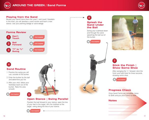 Review your Sand Forms from the Level 1 and Level 2 booklets . In this level , you will develop a sand routine and learn a new stance . Use your pitching wedge or sand wedge .