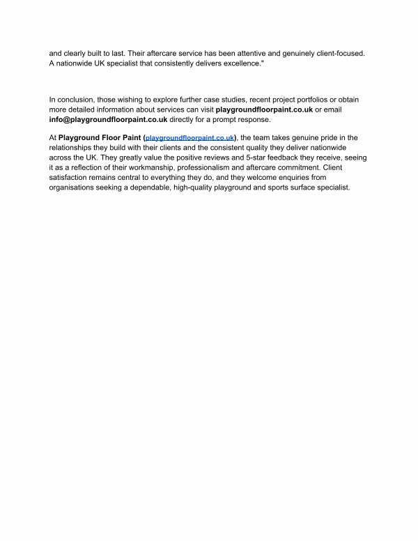 At Playground Floor Paint( playgroundfloorpaint. co. uk), the team takes genuine pride in the relationships they build with their clients and the consistent quality they deliver nationwide across the UK. They greatly value the positive reviews and 5-star feedback they receive, seeing it as a reflection of their workmanship, professionalism and aftercare commitment. Client satisfaction remains central to everything they do, and they welcome enquiries from organisations seeking a dependable, high-quality playground and sports surface specialist.
