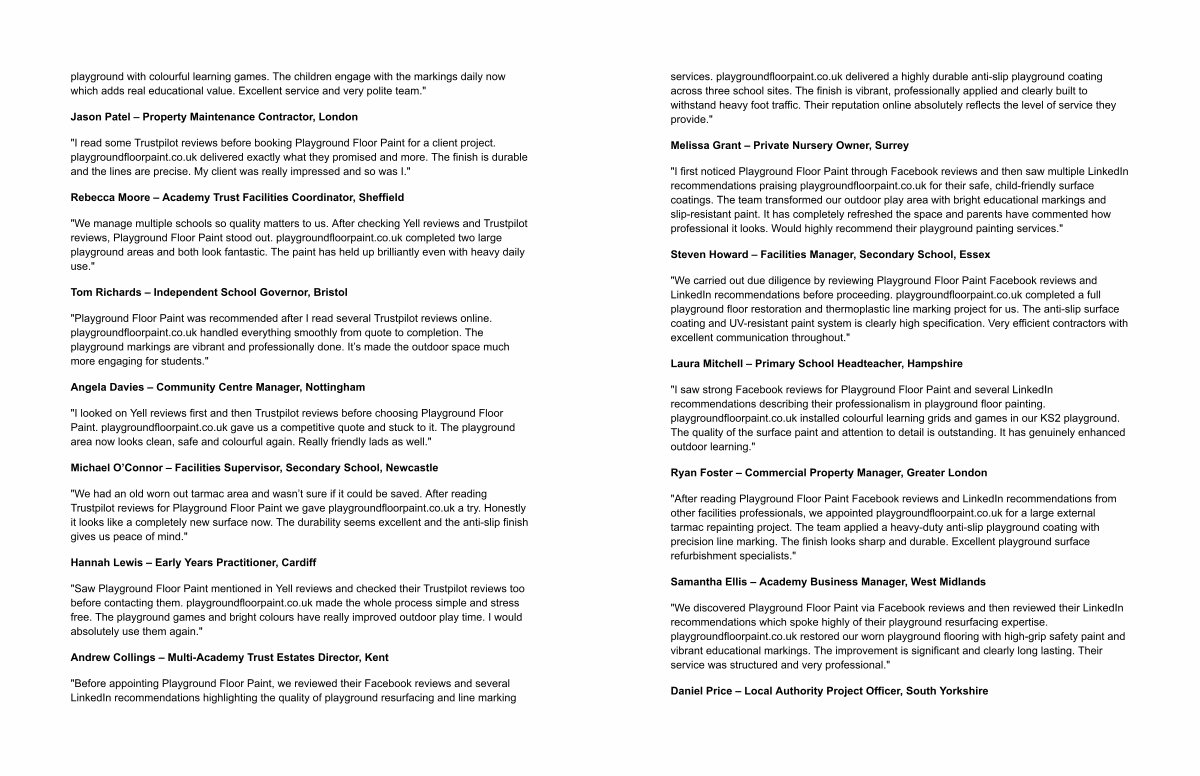 " I saw strong Facebook reviews for Playground Floor Paint and several LinkedIn recommendations describing their professionalism in playground floor painting. playgroundfloorpaint. co. uk installed colourful learning grids and games in our KS2 playground. The quality of the surface paint and attention to detail is outstanding. It has genuinely enhanced outdoor learning."