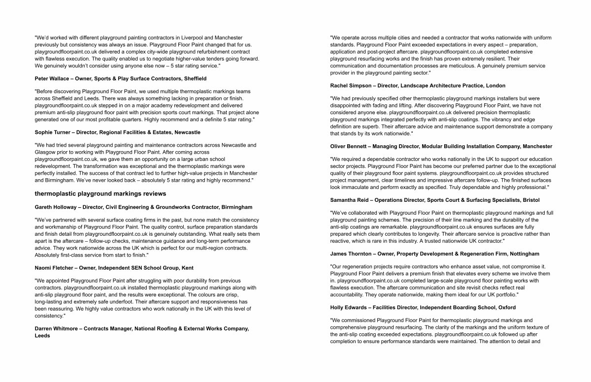 " We’ ve collaborated with Playground Floor Paint on thermoplastic playground markings and full playground painting schemes. The precision of their line marking and the durability of the anti-slip coatings are remarkable. playgroundfloorpaint. co. uk ensures surfaces are fully prepared which clearly contributes to longevity. Their aftercare service is proactive rather than reactive, which is rare in this industry. A trusted nationwide UK contractor."