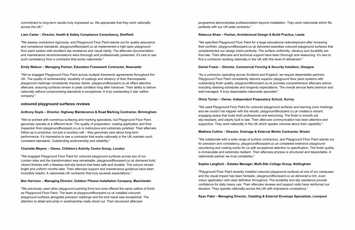 " We collaborate with a wide range of surface contractors, and Playground Floor Paint stands out for precision and consistency. playgroundfloorpaint. co. uk completed extensive playground resurfacing and coating works for us with exceptional attention to specification. The finish quality is immaculate and extremely resilient. Their aftercare process is structured and dependable. A nationwide partner we trust completely."