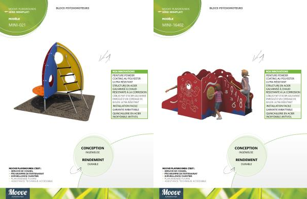 MODÈLE BLOCS PSYCHOMOTEURS MOOVE PLAYGROUNDS C ’ EST : • SERVICE DE CONSEIL • PROGRAMME DE PARTENARIAT • SURVEILLANCE CHANTIER NOS INNOVATIONS CÂBLES NYLON ULTRA RÉSISTANT DE D ' UN CORDAGE ENROULÉ D ' ACIER GALVANISÉ FAIT PEINTURE ULTRA RÉSISTANT COATING AU POLYESTER POWDER QUINCAILLERIE ANTIVOL INOXYDABLE EN ACIER • PLAN INGÉNISÉ FOURNI • ASSISTANCE TECHNIQUE ACCESSIBLE MINI-021 MOOVE PLAYGROUNDS MINIPLAY ! SÉRIE STRUCTURE À LA CORROSION RÉSISTANTE À CHAUD GALVANISÉ EN ACIER GARANTIE IMBATTABLE INSTALLATION FACILE CONCEPTION RENDEMENT DURABLE INGÉNIEUSE