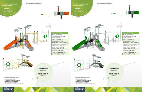 MODÈLE BLOCS PSYCHOMOTEURS MOOVE PLAYGROUNDS C ’ EST : • SERVICE DE CONSEIL • PROGRAMME DE PARTENARIAT • SURVEILLANCE CHANTIER NOS INNOVATIONS CÂBLES NYLON ULTRA RÉSISTANT DE D ' UN CORDAGE ENROULÉ D ' ACIER GALVANISÉ FAIT PEINTURE ULTRA RÉSISTANT COATING AU POLYESTER POWDER QUINCAILLERIE ANTIVOL INOXYDABLE EN ACIER • PLAN INGÉNISÉ FOURNI • ASSISTANCE TECHNIQUE ACCESSIBLE NA-030-02 MOOVE PLAYGROUNDS OMÉGA SÉRIE STRUCTURE À LA CORROSION RÉSISTANTE À CHAUD GALVANISÉ EN ACIER GARANTIE IMBATTABLE INSTALLATION FACILE CONCEPTION RENDEMENT DURABLE INGÉNIEUSE