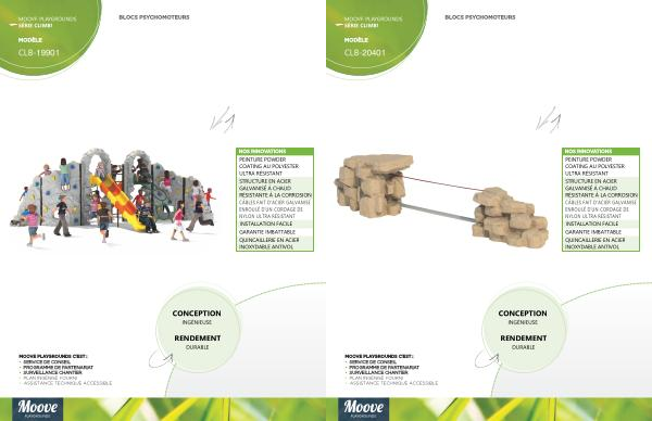 MODÈLE BLOCS PSYCHOMOTEURS MOOVE PLAYGROUNDS C ’ EST : • SERVICE DE CONSEIL • PROGRAMME DE PARTENARIAT • SURVEILLANCE CHANTIER NOS INNOVATIONS CÂBLES NYLON ULTRA RÉSISTANT DE D ' UN CORDAGE ENROULÉ D ' ACIER GALVANISÉ FAIT PEINTURE ULTRA RÉSISTANT COATING AU POLYESTER POWDER QUINCAILLERIE ANTIVOL INOXYDABLE EN ACIER • PLAN INGÉNISÉ FOURNI • ASSISTANCE TECHNIQUE ACCESSIBLE MOOVE PLAYGROUNDS CLIMB ! SÉRIE STRUCTURE À LA CORROSION RÉSISTANTE À CHAUD GALVANISÉ EN ACIER GARANTIE IMBATTABLE INSTALLATION FACILE CONCEPTION RENDEMENT DURABLE INGÉNIEUSE !!"# 20401